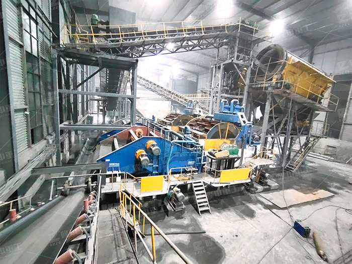 物料先經(jīng)過擦洗機(jī)進(jìn)行擦洗,除去砂顆粒表面附著的泥粉;擦洗后的物料進(jìn)入輪洗洗砂機(jī)進(jìn)行二次清洗、控水,達(dá)到泥沙分離效果,最后清洗后的粗、細(xì)砂進(jìn)入脫水篩進(jìn)行脫水,因此實(shí)現(xiàn)高效洗砂。