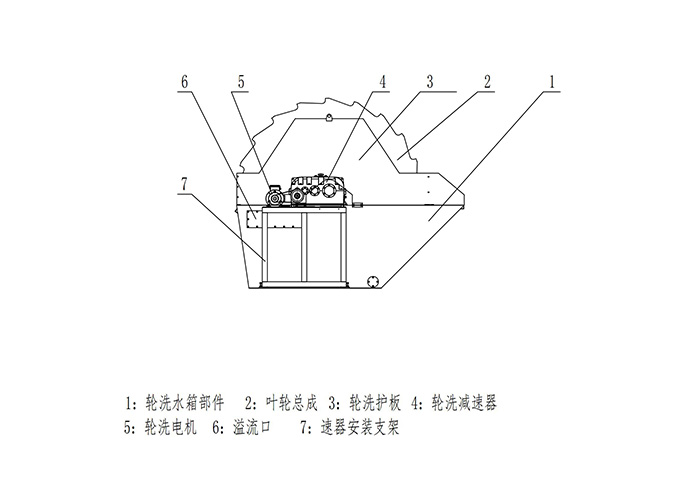 工作時,物料在葉輪的帶動下進行清洗,除去覆蓋在砂石表面的雜質,同時在水流的作用下將雜質及粒度較小的泥,粉等帶走,完成清洗,洗過的砂石由輪斗提升脫水,并經噴淋裝置進行二次沖洗,沖洗后再次提升脫水,從出料端產出干凈的砂。