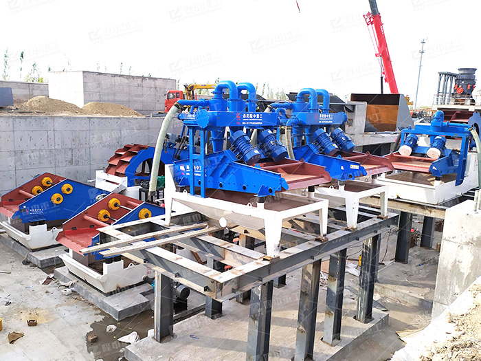 該設(shè)備是隆中結(jié)合砂粉的實(shí)際情況而設(shè)計(jì)的具有技術(shù)水平的細(xì)砂提取裝置,泵將篩下水箱中的砂水混合物輸送至分離系統(tǒng),經(jīng)分離器濃縮的細(xì)砂由分離出料口提供給脫水篩,與篩上粗砂一起脫水后產(chǎn)出成品砂,實(shí)現(xiàn)細(xì)砂回收的利用。脫水篩脫水過程中,少量細(xì)砂透過篩網(wǎng)再次回到篩下水箱,經(jīng)泵與分離系統(tǒng)重復(fù)抽取,再次回收,最終實(shí)現(xiàn)細(xì)砂的有效回收。