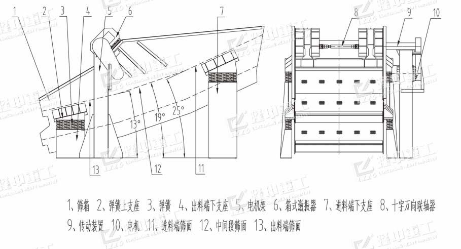 香蕉篩主要由篩箱、篩網(wǎng)、激振器、減振彈簧和下座架等組成。香蕉篩是由電動機和激振器作為振動源,激振器主要是由偏心軸、皮帶輪、軸承及軸承座等組成,激振器安裝在篩箱側(cè)板上,并由電動機通過三角皮帶或軟連接與其相連,電動機帶動偏心軸旋轉(zhuǎn),產(chǎn)生離心慣性力,迫使篩箱振動。