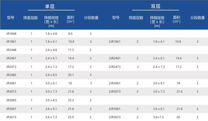 該系列根據(jù)篩機不同用途及處理量大小,采用不同的篩分面積、篩縫尺寸、篩面分段數(shù)量以及篩面傾角,分單層和雙層產(chǎn)品,工作面積5.7m2~30.2m2,共20種主要規(guī)格型號,可基本滿足各種類型礦井和選煤廠生產(chǎn)需要。